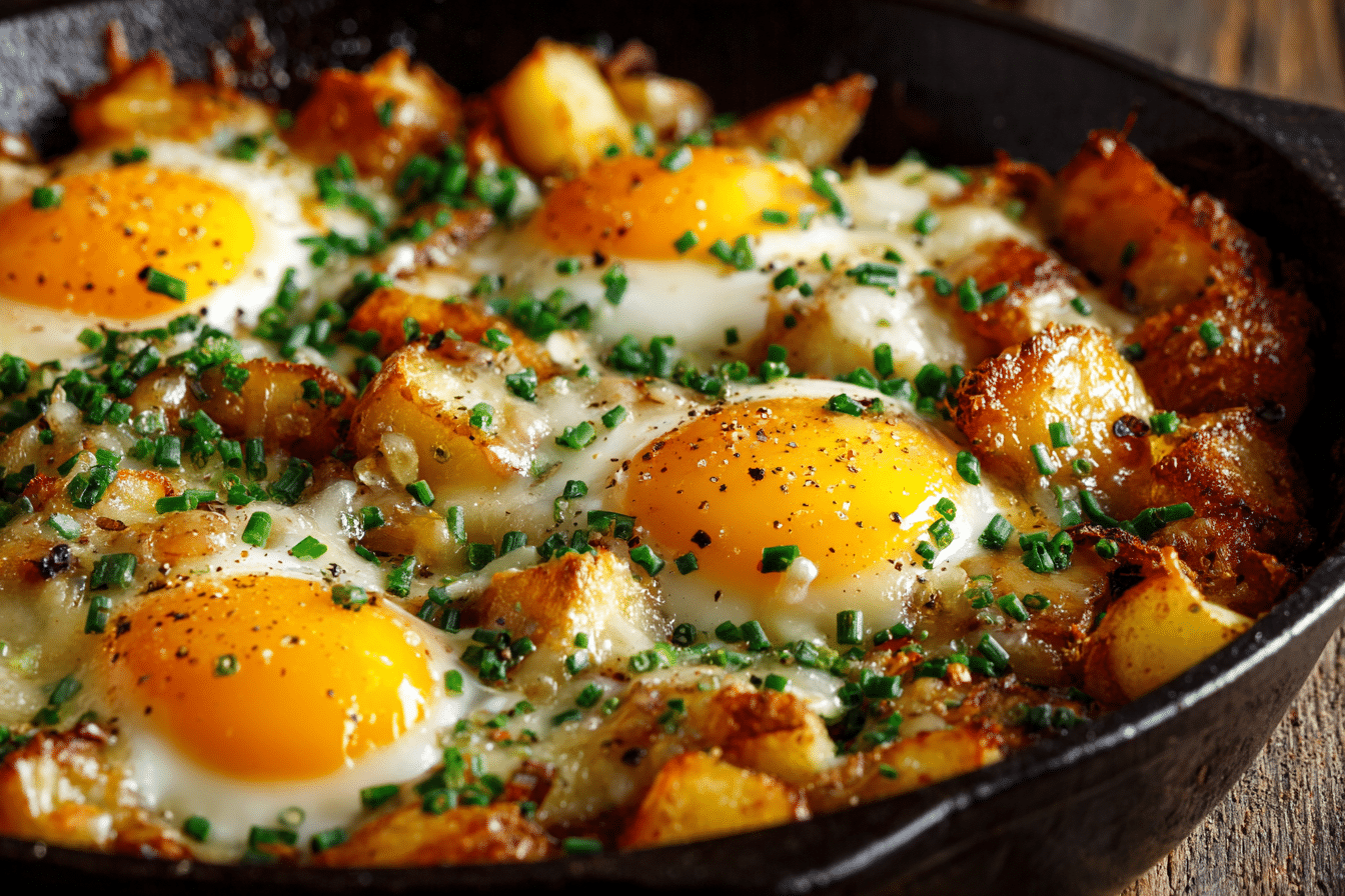 Prepared in a sturdy skillet, this recipe keeps cleanup simple and presentation rustic. Whether served for a relaxed brunch or an early family breakfast, Cheesy Egg and Potato Breakfast Skillet offers warmth, savory depth, and satisfying texture in each forkful.