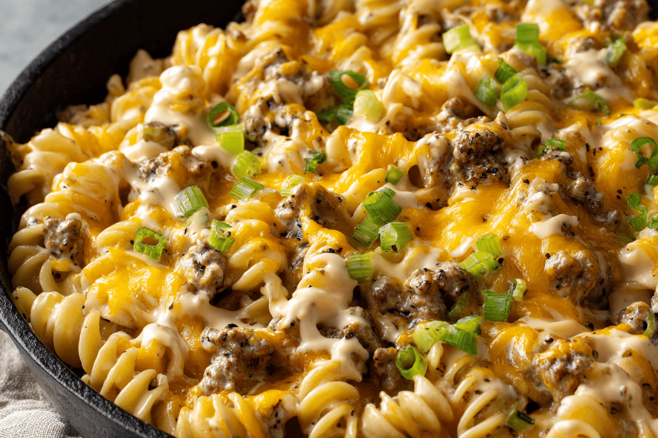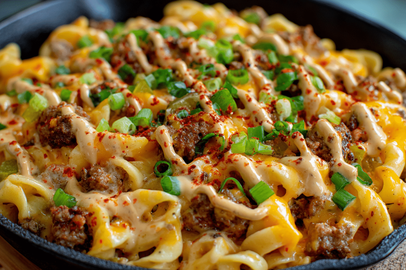 All the comforting flavors of a cheeseburger come together in this one-pan pasta dish. Juicy ground beef, melty cheddar, tender noodles, and a hint of burger sauce make this a weeknight winner.