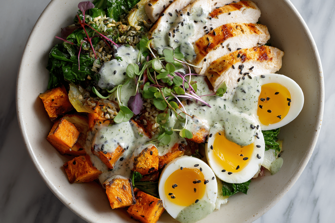 Each bowl is a well-rounded blend of protein, complex carbohydrates, and healthy fats. Sweet potatoes are rich in fiber, potassium, and antioxidants. Chicken and eggs offer high-quality protein for muscle support and satiety, while avocado brings in beneficial fats and a silky finish.