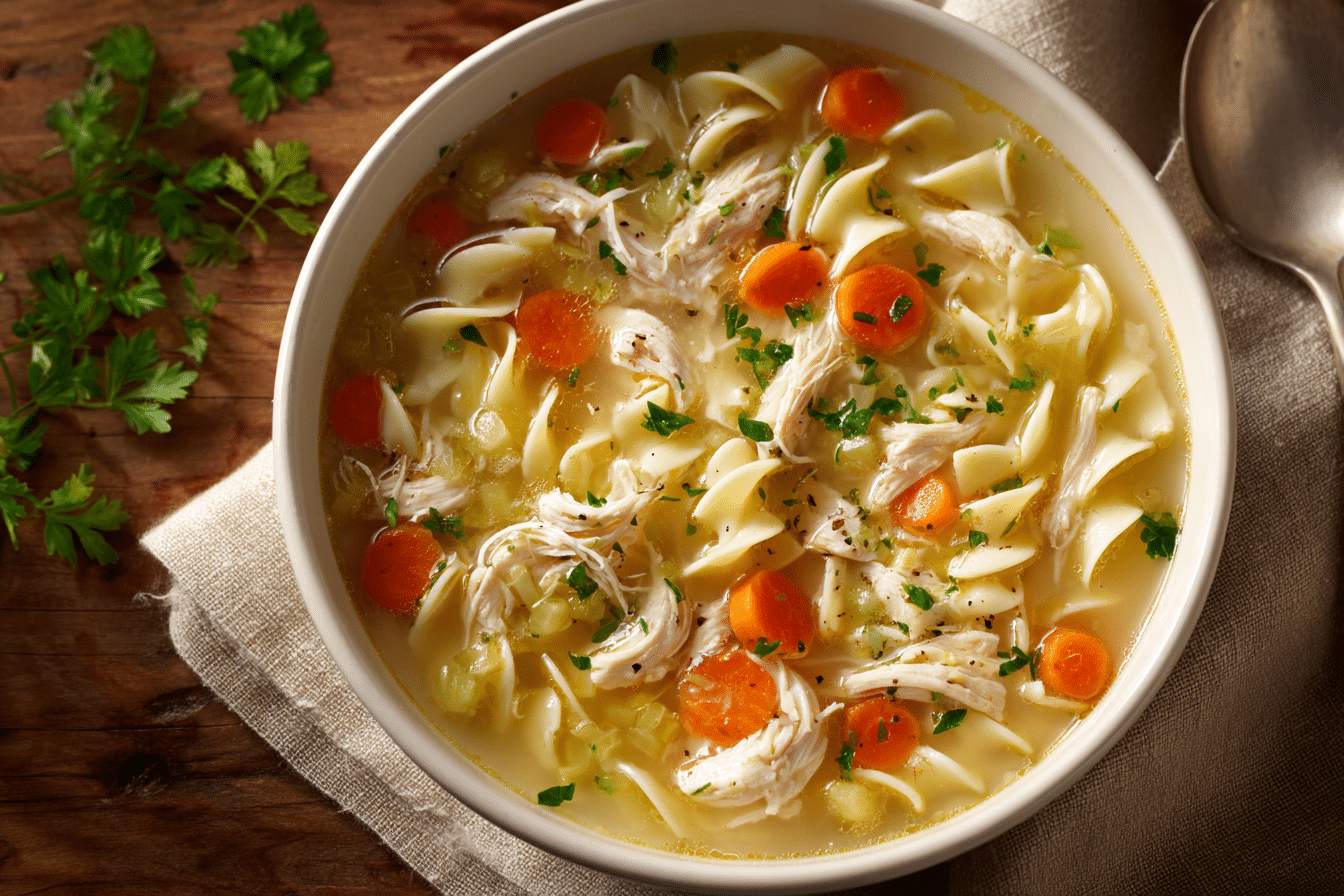 A slow-simmered chicken noodle soup made with tender chicken, soft noodles, and aromatic vegetables—an easy, soothing meal perfect for recovery or comfort days.