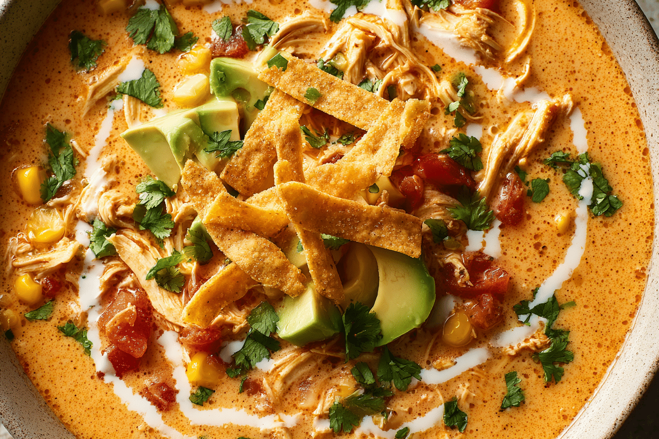 Creamy Chicken Tortilla Soup is a comforting soup featuring tender shredded chicken, black beans, corn, warm spices, and a smooth creamy broth topped with crisp tortilla strips and fresh garnishes.