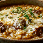 A warm, comforting soup made with slow-cooked onions, tender beef, barley, and herbs in a creamy, savory broth. A fusion of French onion soup and classic beef stew in one hearty bowl.