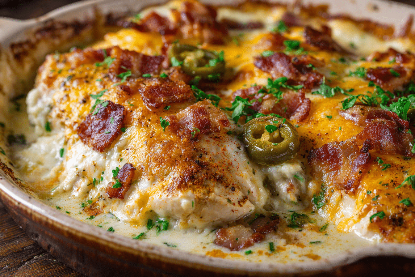 Tender chicken breasts are smothered in a smooth, cheesy mixture, then topped with spicy jalapeños, smoky bacon, and a golden layer of cheddar. The result is a creamy, slightly spicy, deeply satisfying dish that’s perfect for weeknight dinners or casual gatherings.