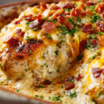 Tender chicken breasts are smothered in a smooth, cheesy mixture, then topped with spicy jalapeños, smoky bacon, and a golden layer of cheddar. The result is a creamy, slightly spicy, deeply satisfying dish that’s perfect for weeknight dinners or casual gatherings.