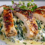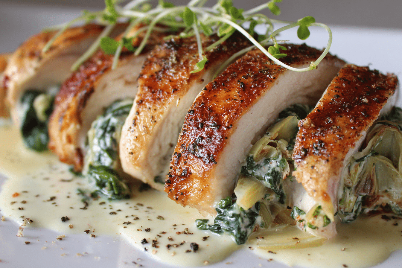 Juicy chicken breasts filled with a creamy blend of spinach, artichoke hearts, and cheese. Pan-seared and baked to perfection for a simple, rich, and flavorful dinner.