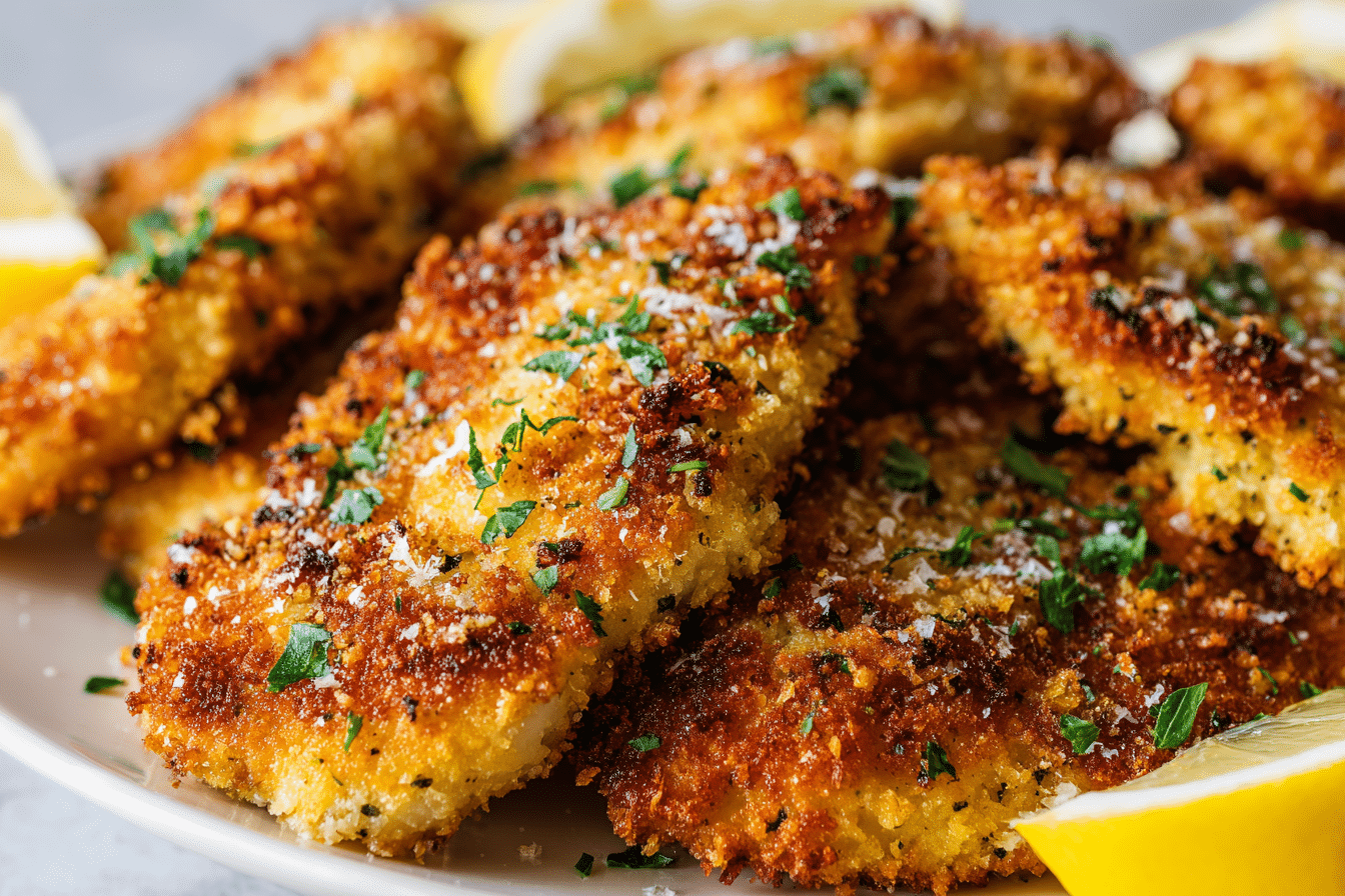Prepare three shallow bowls. In the initial bowl, place flour seasoned lightly with salt and pepper. In the second bowl, whisk together two large eggs with a tablespoon of milk until smooth. In the third bowl, combine panko breadcrumbs, freshly grated Parmesan, garlic powder, Italian seasoning, paprika, salt, and pepper.