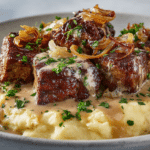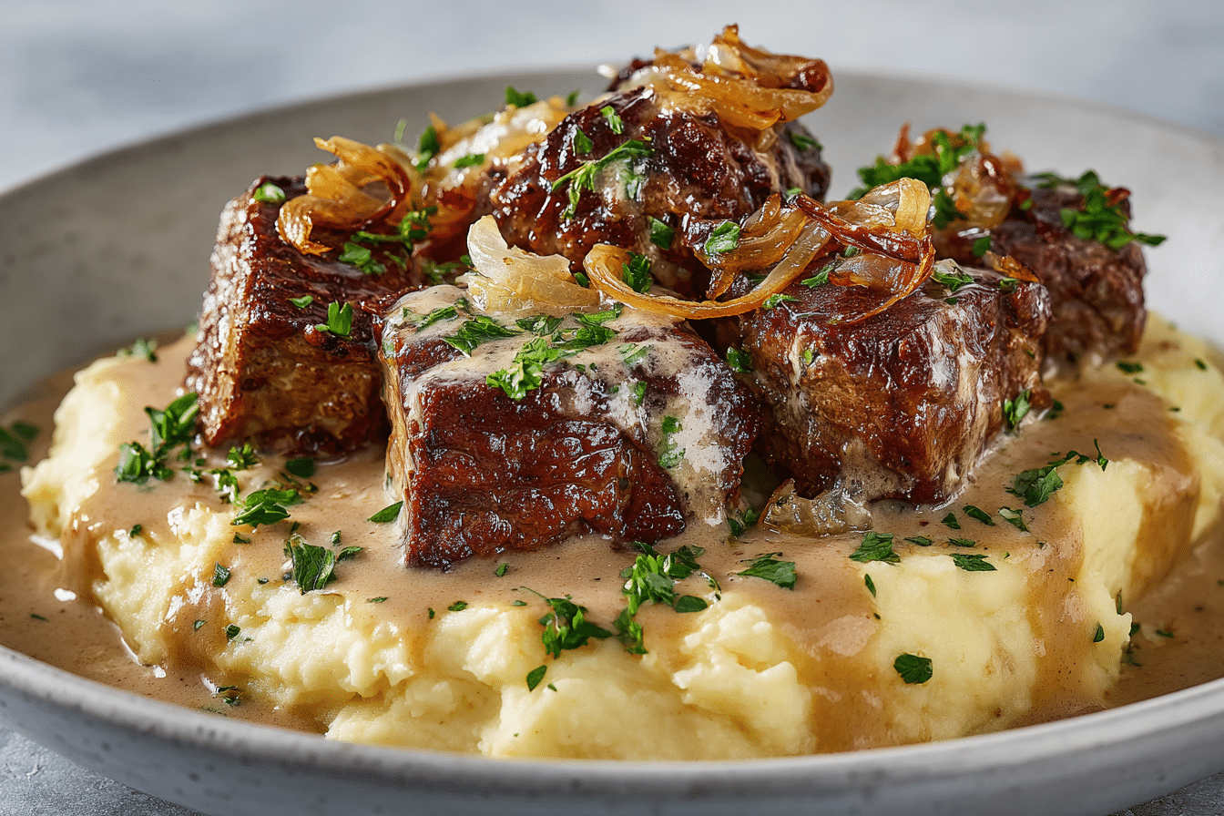 Golden-seared steak bites smothered in a creamy garlic sauce, served over fluffy mashed potatoes blended with butter and Parmesan. Rich, hearty, and ready in under 30 minutes.