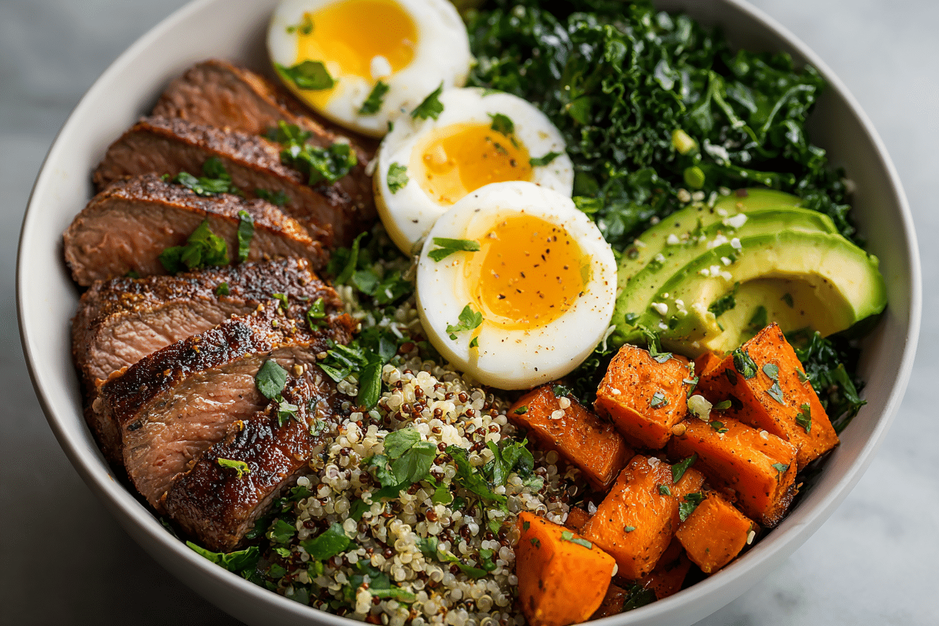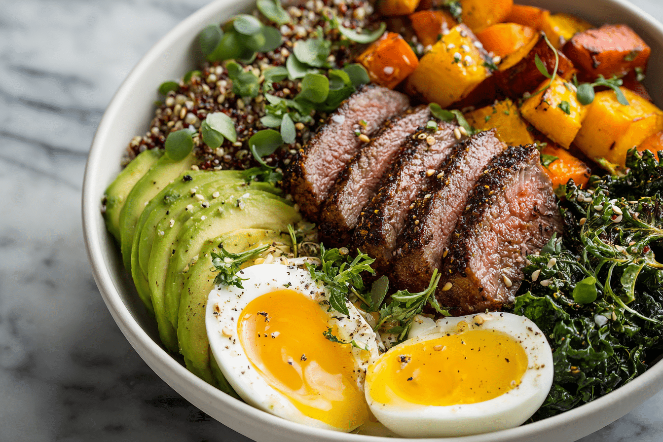 Hearty steak and egg power bowls featuring roasted vegetables, whole grains, and fresh greens. High-protein, satisfying, and easy to customize.