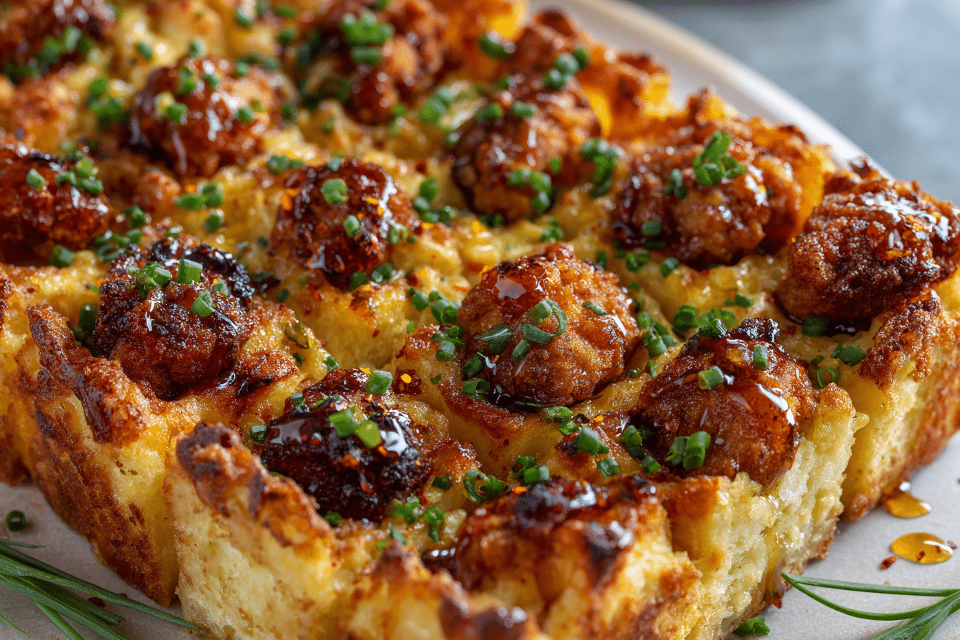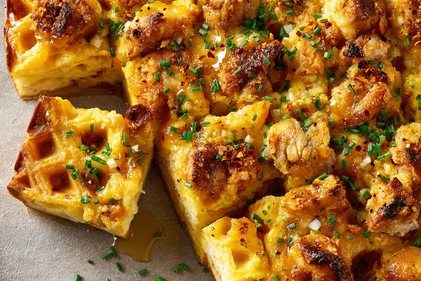 A sweet and savory breakfast casserole featuring crispy chicken, golden waffles, and a maple custard. Finished with a drizzle of hot honey, this dish is a crowd-pleasing brunch favorite.