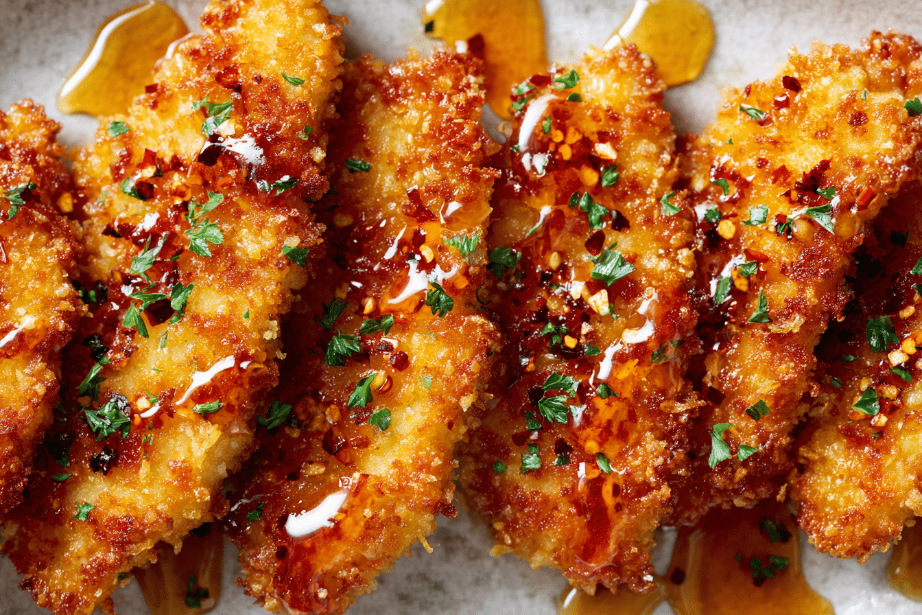 Hot Honey Crispy Chicken Cutlets combine golden, crunchy chicken with a glossy drizzle of sweet heat that clings to every ridge of the crust. Each bite delivers a contrast of textures: a crackly coating on the outside and tender, juicy chicken inside, finished with warm honey infused with chili.