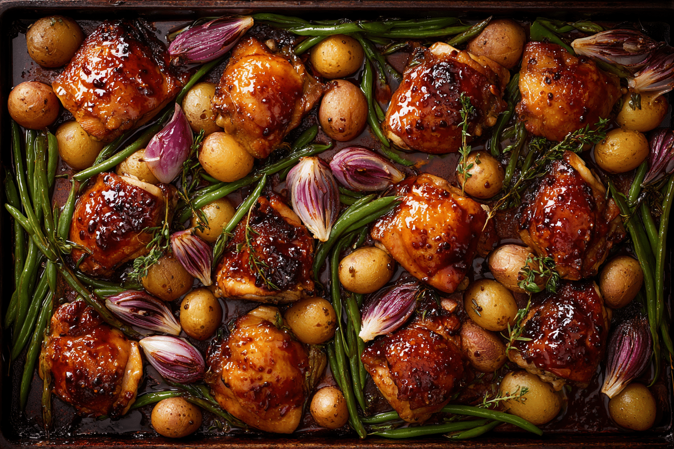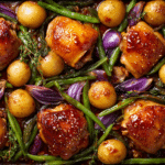 Looking for a dinner that’s big on taste and light on effort? This Hot Honey Garlic Chicken Thigh Tray Bake brings everything to the table—literally. With juicy chicken thighs roasted to golden perfection and coated in a sticky, sweet-and-spicy glaze, this dish transforms a handful of simple ingredients into something truly special. Roasted vegetables share the tray, soaking up the glaze and pan drippings for a delicious, mess-free meal.