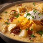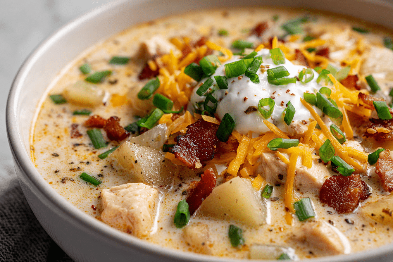 A cozy, creamy soup filled with tender chicken, soft potatoes, smoky bacon, and melted cheddar, topped with green onions—just like a loaded baked potato in every spoonful.