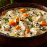 This dish is a balanced, all-in-one meal. Chicken delivers protein, wild rice contributes fiber and complex carbs, and the vegetables offer a healthy dose of vitamins. The creamy broth ties everything together into a filling and flavorful bowl.
