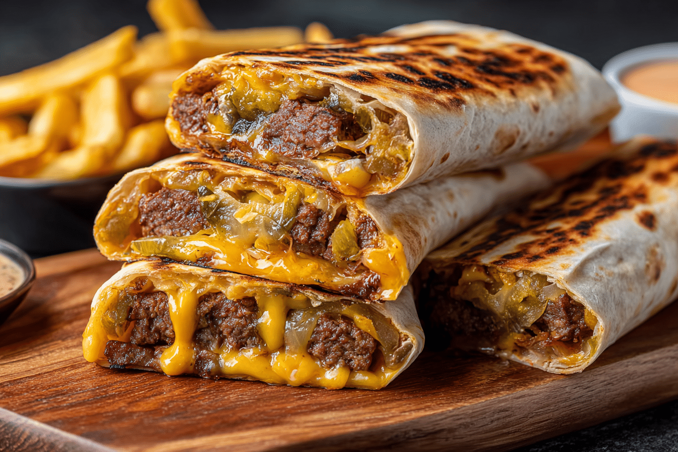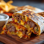 By pressing seasoned ground beef directly into a tortilla and cooking it flat like a quesadilla, you get maximum crust, melty cheese, and a foldable finish that’s easy to eat and hard to resist. The wrap is seared until crispy, filled with all the classic burger fixings, then folded and quickly toasted again to lock everything in.