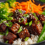 Sticky Honey Garlic Beef Bowls are ideal for weeknight dinners, meal prep lunches, or casual gatherings. Because the components can be prepared separately, they are easy to assemble just before serving.